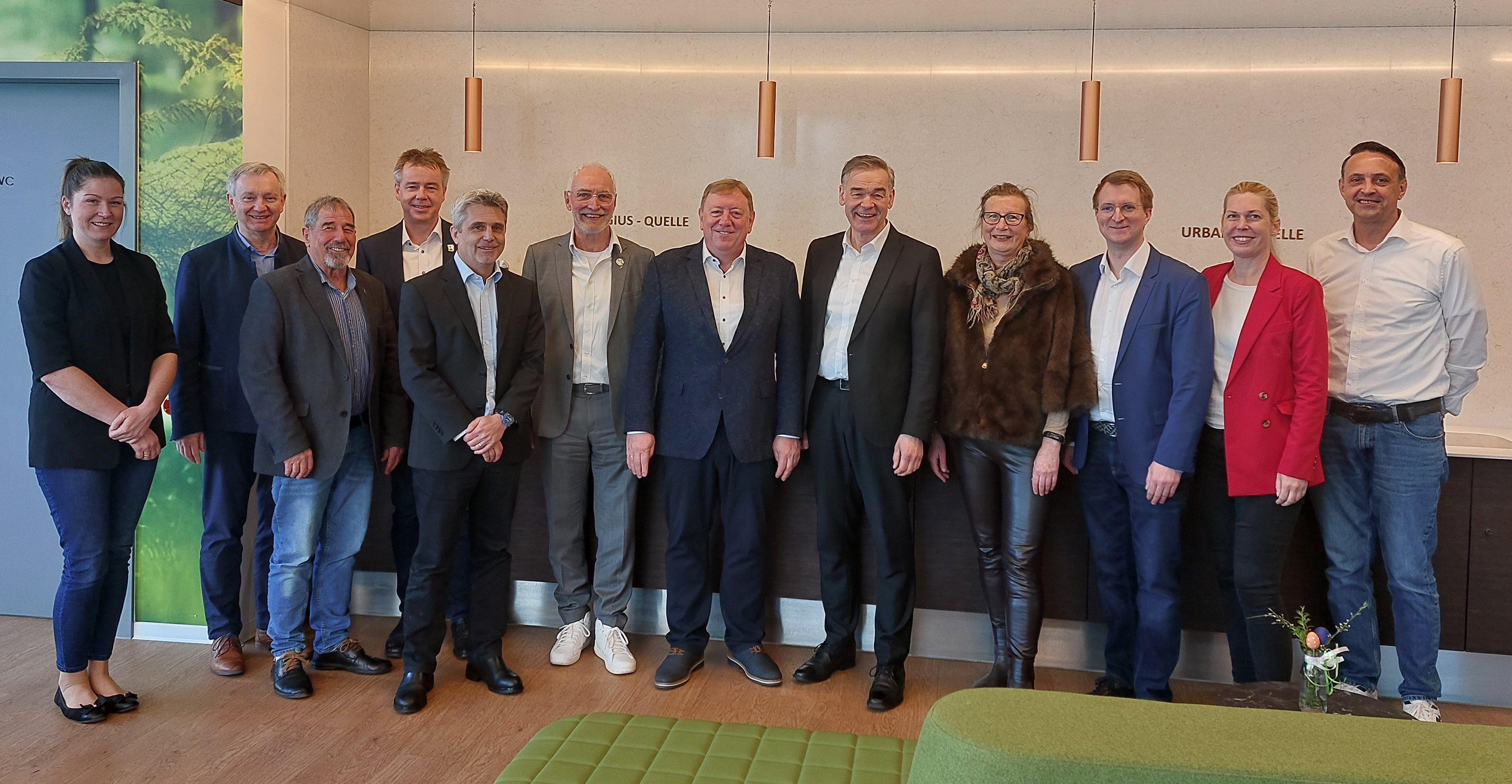 "Statt vorrangig über Kürzungen zu sprechen, muss es doch darum gehen, Krankheiten gar nicht erst entstehen zu lassen - und genau hier setzen die Kurorte an", sagte Bayerns Heilbäderpräsident Landrat Peter Berek jetzt bei einer Vorstandssitzung des Bayerischen Heilbäder-Verbands im unterfränkischen Bad Königshofen. v.l.: Magdalena Resch (Geschäftsstelle), Sepp Barth (Vorstandsmitglied), Dr. Christian Alex (Beratender Arzt), Thomas Beck (Schatzmeister), Frank Oette (Geschäftsführer), Dr. med. Roland Köth (3. Bürgermeister Bad Königshofen); Werner Angermüller (Vorstandsmitglied und Kurdirektor Bad Königshofen), Peter Berek (1. Vorsitzender), Gabriella Squarra (Expertin Waldgesundheit), Tobias Kurz (2. Vorsitzender), Cathrin Herd (Vorstandsmitglied), Franz Mühldorfer (Rechnungsprüfer). Foto: BHV